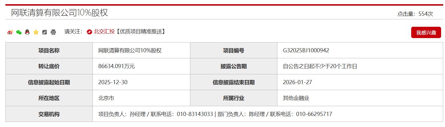 日前,北京产权交易所信息显示,网联清算10%股权被挂牌转让,底价8.66亿元。转让方梧桐树投资平台有限责任公司(以下简称梧桐树平台)持股比例为10%,梧桐树平台由国家外汇管理局中央外汇业务中心全资控股。